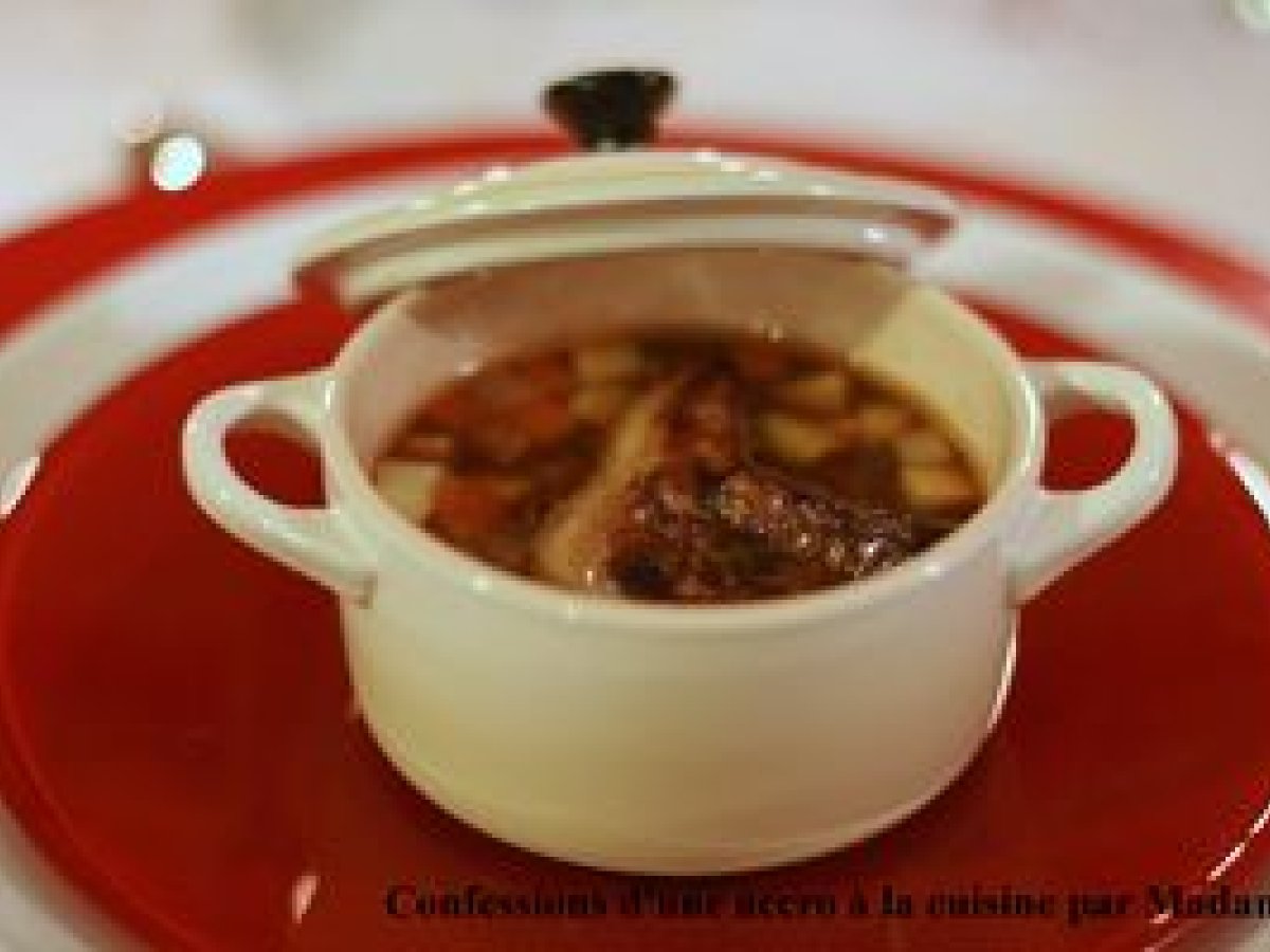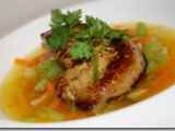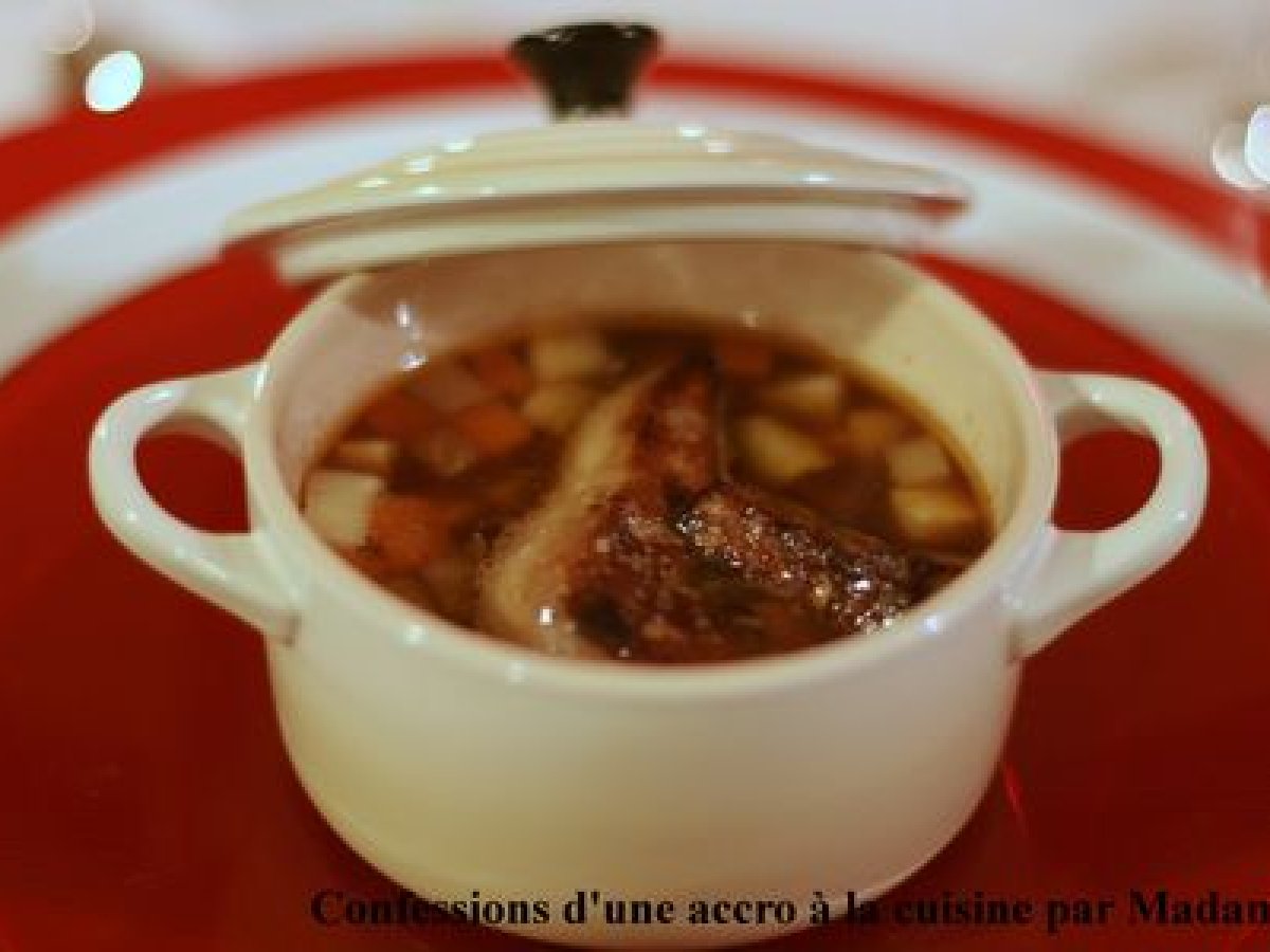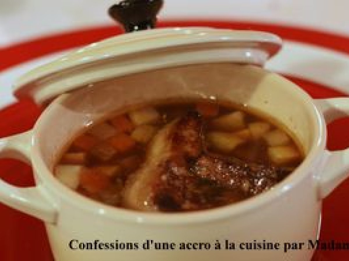 Foie gras en cocotte, légumes anciens et bouillon gingembre-orange votez maintenant PrécédentSuivant Platfacile30 min2282 Kcal Envoyer cette recette à un ami Imprimer cette page Poser une question à l'auteur Publier votre photo de cette recette Ingrédients 4 4 petites escalopes de foie gras frais 200 g de potiron 1 panais (soit environ 150 à 200 g) 1 rutabaga (soit à peu près la même quantité) poivre fleur de sel Pour le bouillon: 25 cl de bouillon de volaille (j'en avais fait un maison c'est mieux, sinon compter 1 cube de bouillon pour 25 cl d'eau) 10 cl de vin blanc sucré (type Loupiac) 1/2 orange bio 25 + 10 g de gingembre frais 1 cuillère à soupe de miel neutre 10 grains de poivre de Sichuan 1 pincée de piment d'espelette sel poivre blanc
