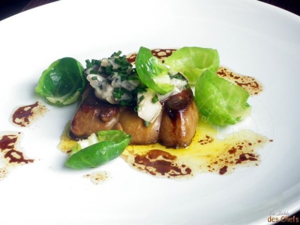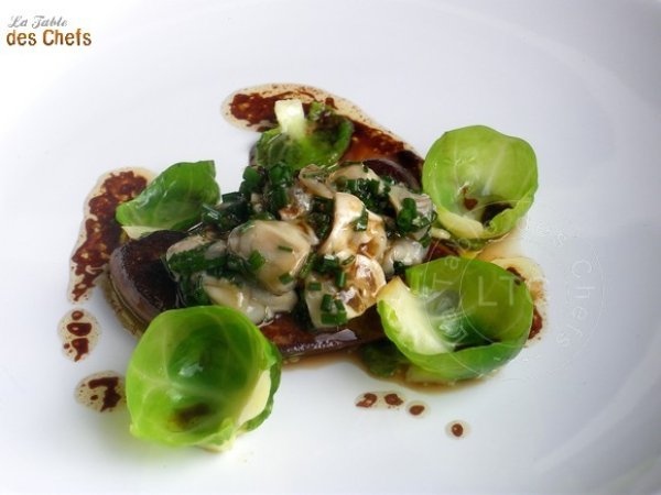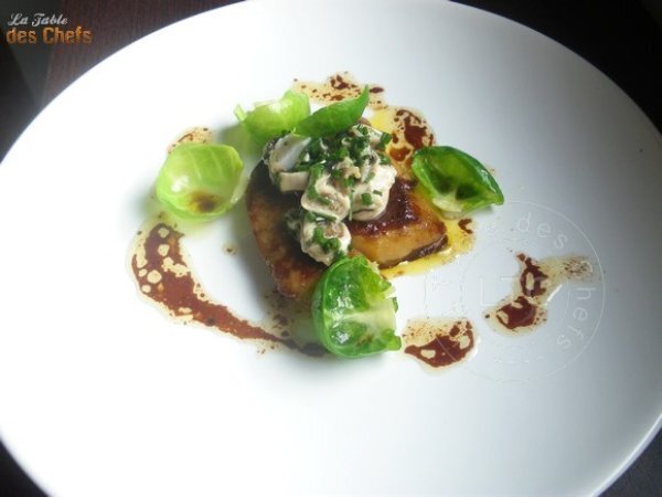 Foie gras poêlé et laqué, avec un tartare d'huître et choux de bruxelles