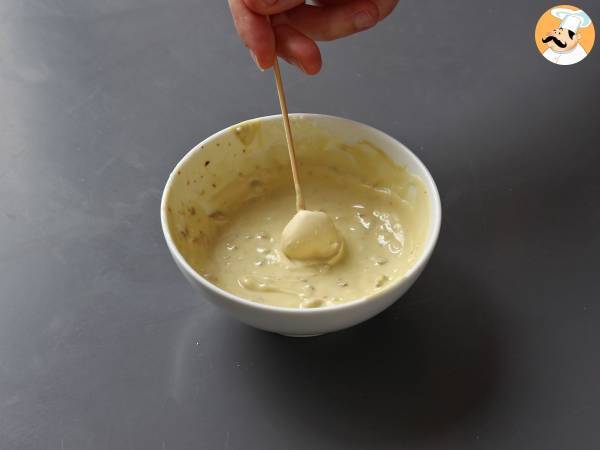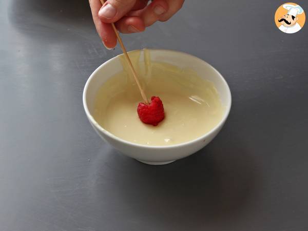 Piquer les framboises et les plonger une par une dans le chocolat blanc.