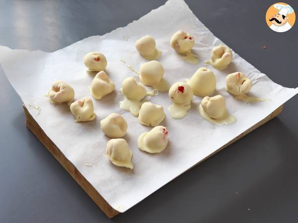 Cela va permettre au chocolat blanc de figer rapidement autour du fruit mais aussi éviter qu’il ne ramollisse ou ne libère de jus.