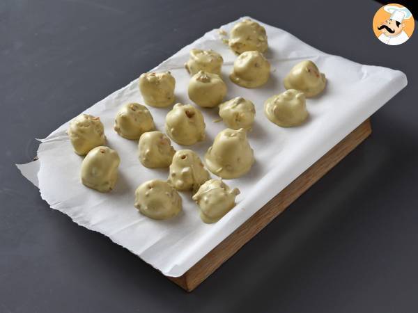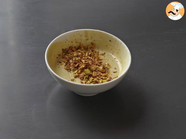 En fonction de la pâte de pistache que vous allez utiliser, vous obtiendrez une une couleur plus ou moins verte et donc plus ou moins contrastante avec le chocolat blanc. Vous pouvez alors supprimer l'étape 2, 3 et 4 et retirer le chocolat blanc (utilisé nature) des ingrédients si vous utilisez une pâte à tartiner à la pistache (assez claire).