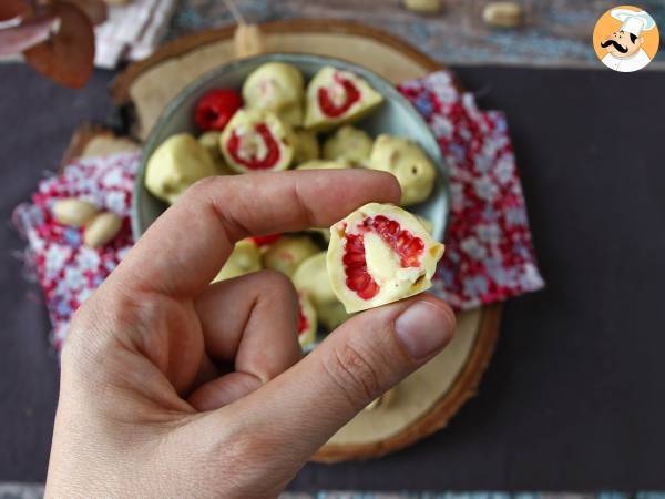 Placer les framboises enrobées de chocolat blanc sur une assiette ou planche recouverte de papier sulfurisé, puis au congélateur pendant au moins 10 minutes.