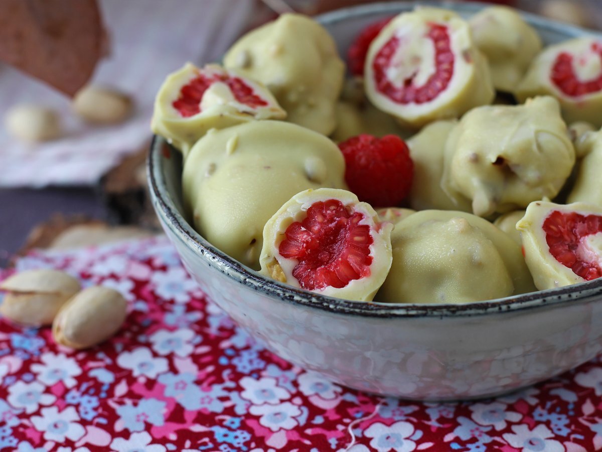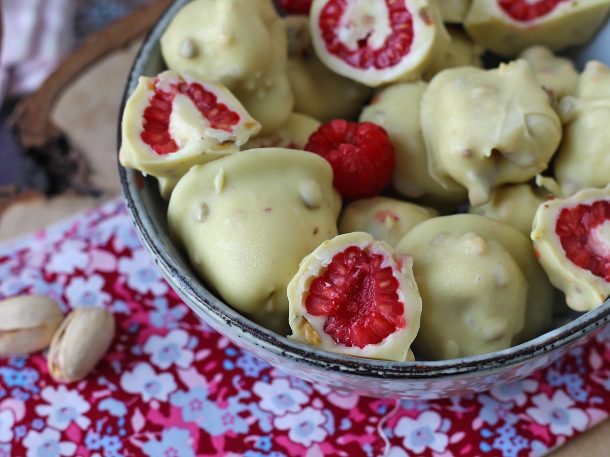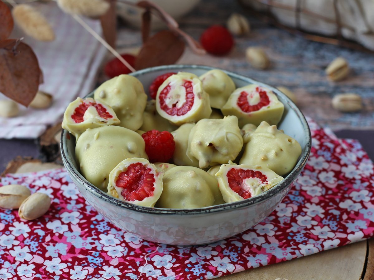 Franui à la pistache, de délicieuses framboises enrobées, fondantes et croquantes