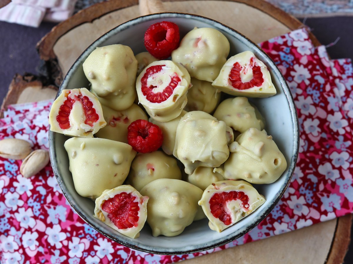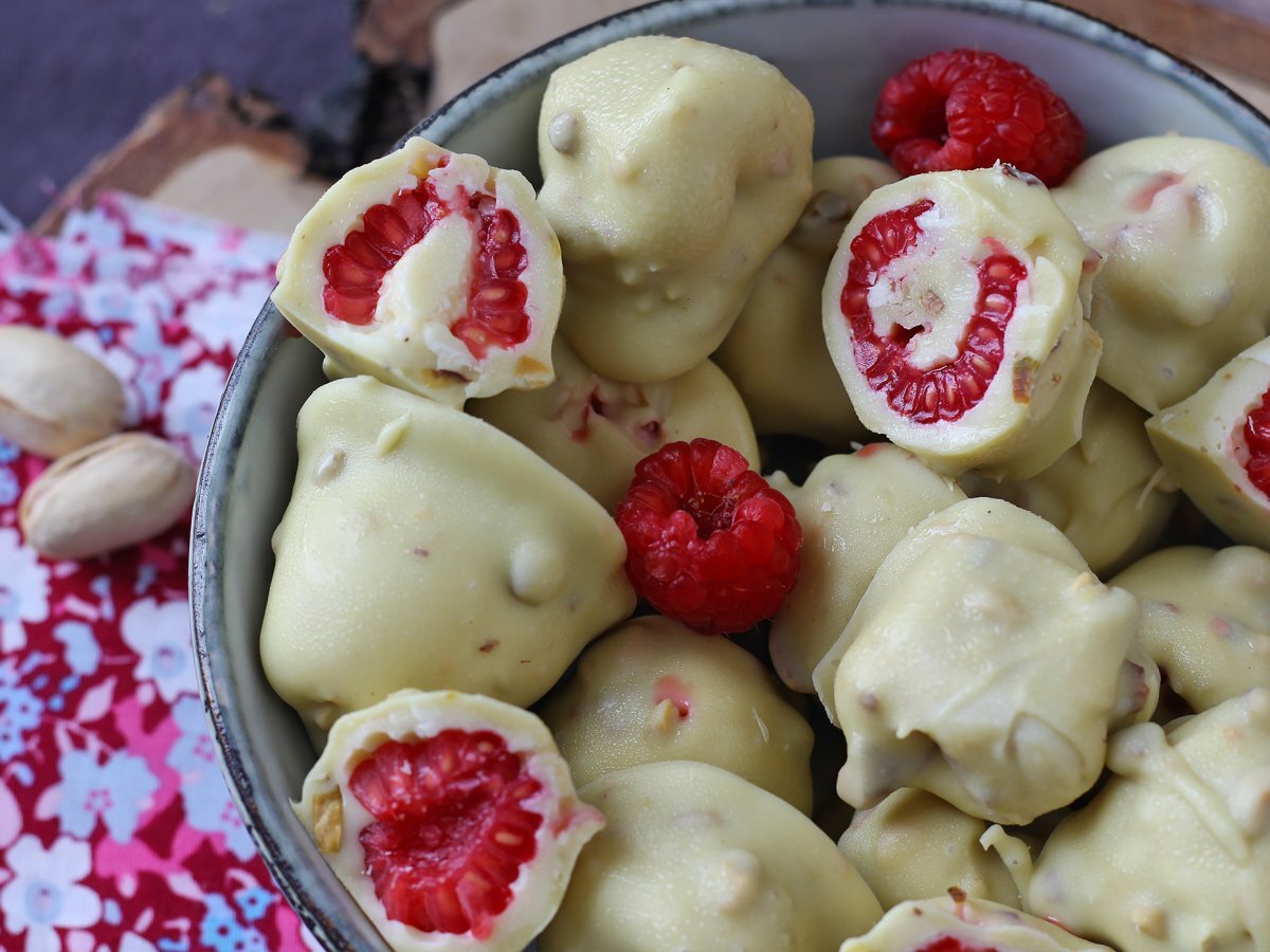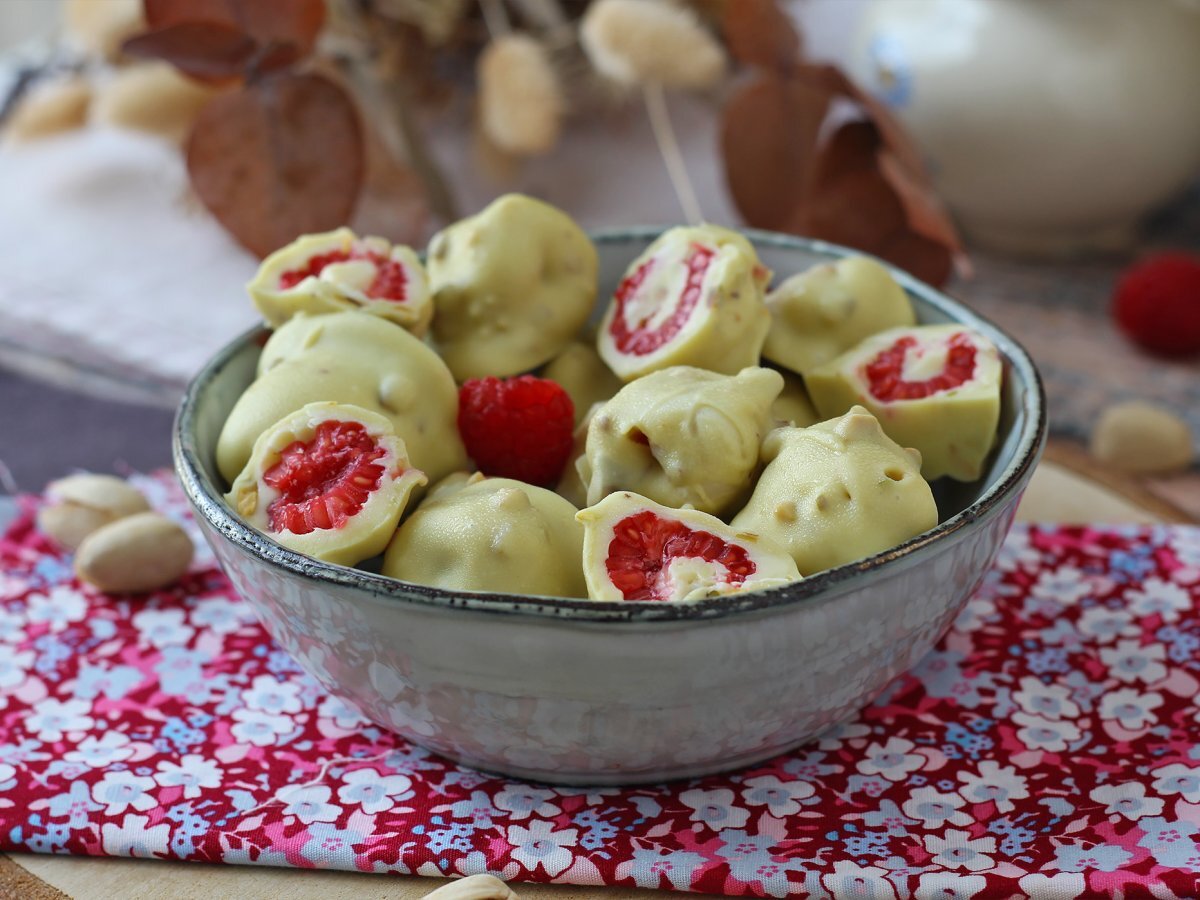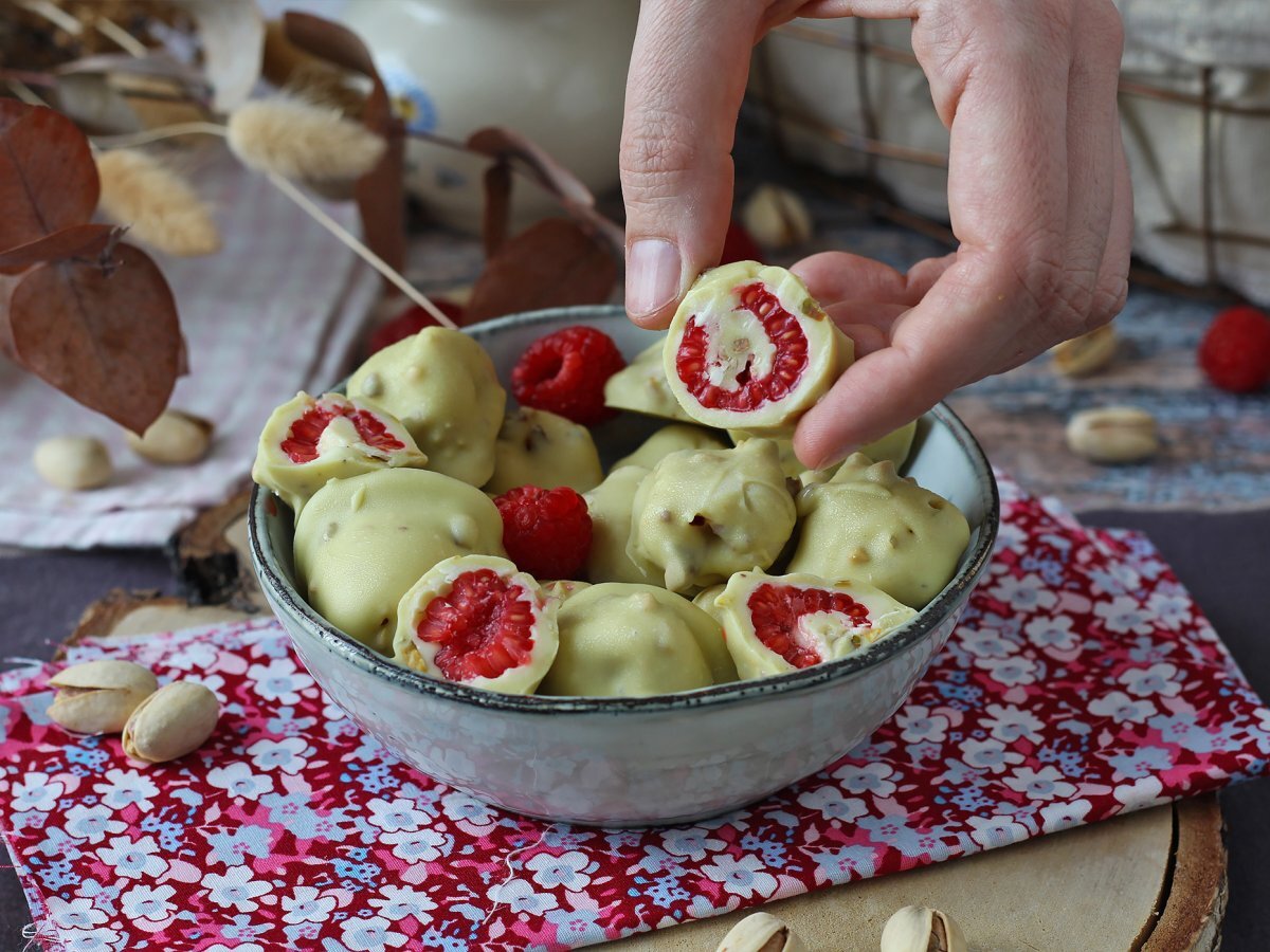 Franui à la pistache, de délicieuses framboises enrobées, fondantes et croquantes