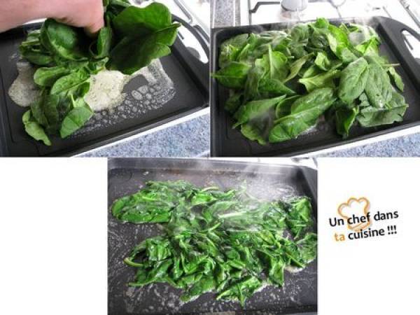 Laver et bien essorer les épinards, les cuire à la plancha avec une noix de beurre, assaisonner de sel, poivre et muscade.