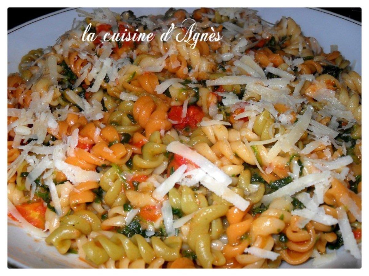Des pâtes savoureuses , rapides et faciles aux couleurs de l’italie avec ces fusilli colorées Un plat de pâtes « bon marché » plein de saveurs relevé par le Romano (fromage à base de lait entier de brebis au goût très prononcé )et très complet puisqu’il réunit des féculents, légume vert avec l’épinard, fruit avec la tomate( en hiver je préfère le surgelé ou la conserve car la tomate n’a pas de goût mais l’été je prendrais des fraiches ..et peut être même des tomates cerise pour changer.. )