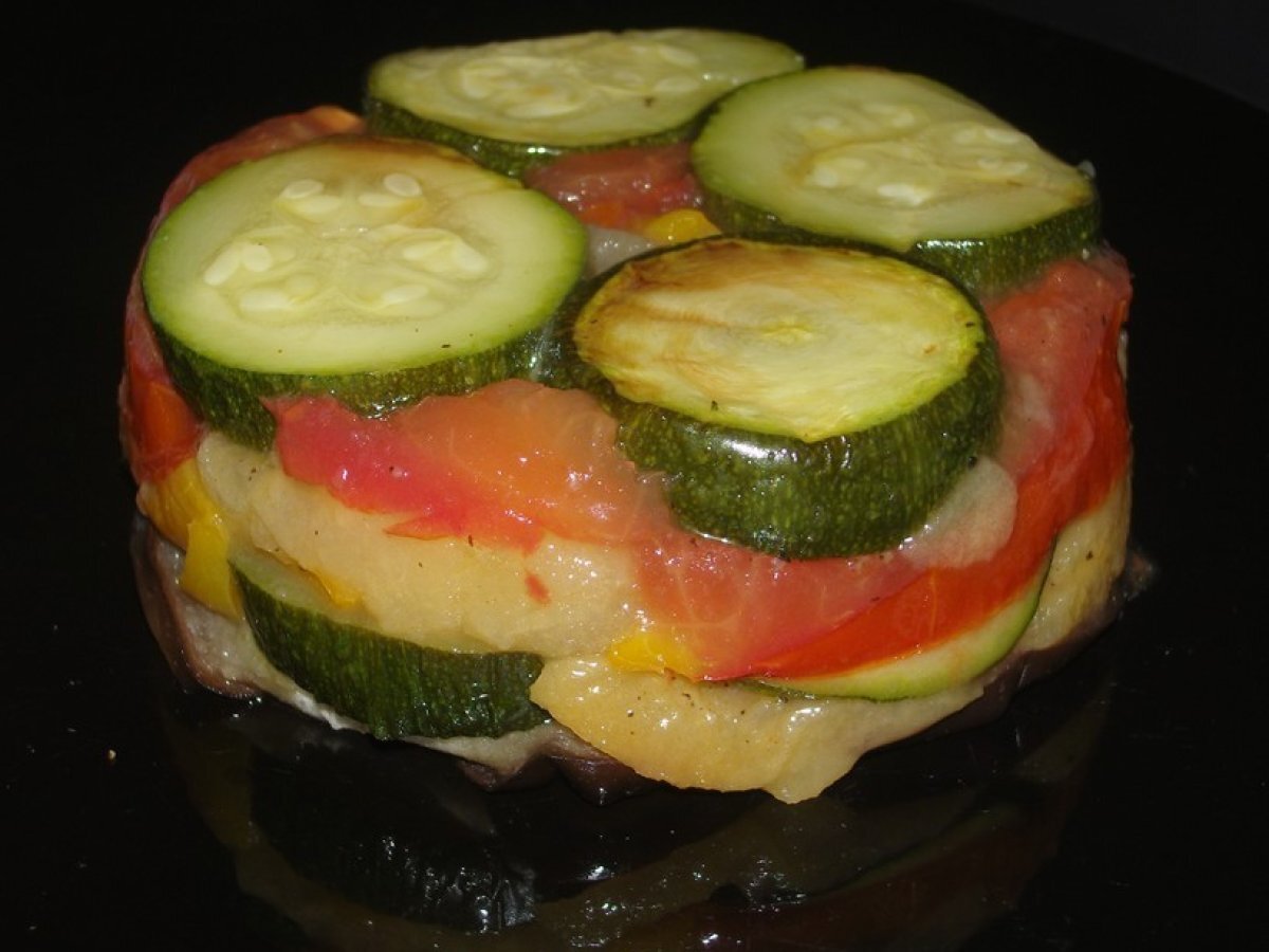 Gâteau de légumes Platmoyen35 min Envoyer cette recette à un ami Imprimer cette page Poser une question à l'auteur Publier votre photo de cette recette Ingrédients 5 2 courgettes 1 aubergine 2 pommes fruit (1 royal gala + 1 pomme verte ; choisir des pommes qui tiennent à la cuisson) 2 tomates (moyennement mûres) 1 poivron jaune de l'huile d'olive 30g de beurre demi-sel du sel, du poivre