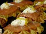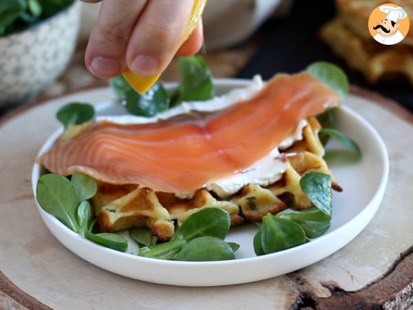 • Gaufres de pommes de terre - Sandwich de gaufres au saumon fumé et au fromage frais - Préparation etape 7Déposer une tranche de saumon fumé sur la gaufre, verser le jus de citron par dessus. Refermer avec la deuxième gaufre tartinée.