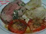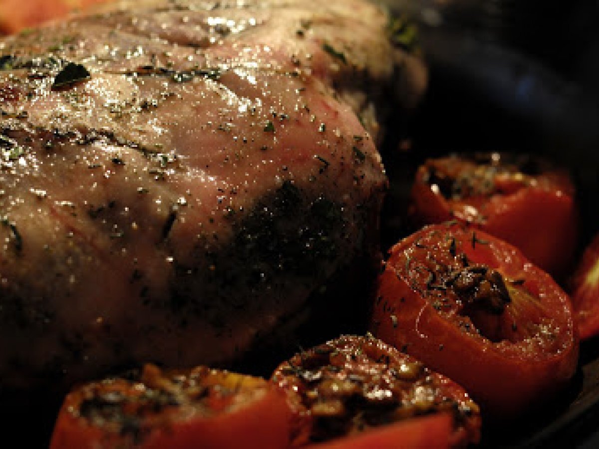 Sur chaque assiette, disposer quelques tranches de gigot, une tomate confite, deux pommes de terre et arroser d'un peu de jus de cuisson.