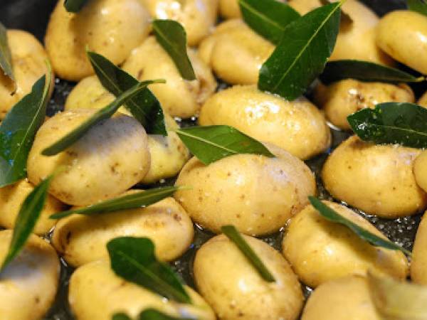 Découper les pommes de terre en 2 dans le sens de la longueur, et faire une incision sur chaque sommet. Glisser alors dans l'incision une feuille de laurier. Celle-ci, pendant la cuisson va délicieusement parfumer la pomme de terre.
