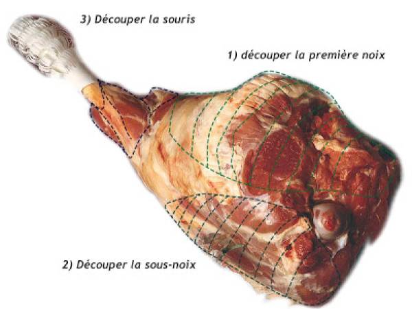 La découpe est primordiale, et pourtant il existe encore des gens pour découper le gigot parallèlement à l'os : Non seulement cela offre des tranches coupées dans le sens de la fibre et donc très désagréables à mâcher, mais en plus, on aura des morceaux sans gras aucun et d'autres avec trop de gras, des morceaux très saignants et d'autres très cuits. Au contraire, si l'on procède noix par noix en finissant par la souris, on obtient des morceaux parfaitement équilibrés, magnifiquement entourés d'un croustillant ruban de gras et proposant des cuissons pour (quasi) tous les goûts.