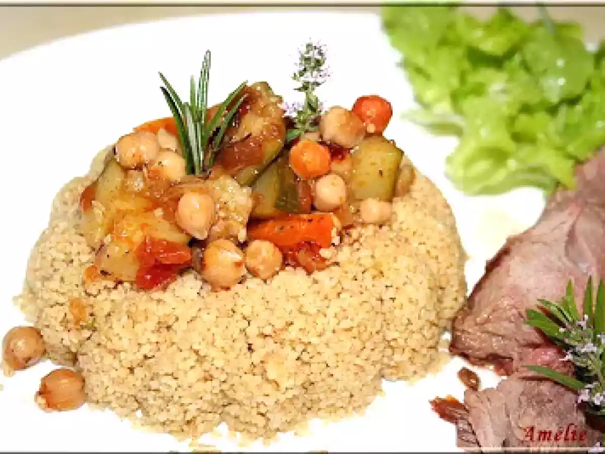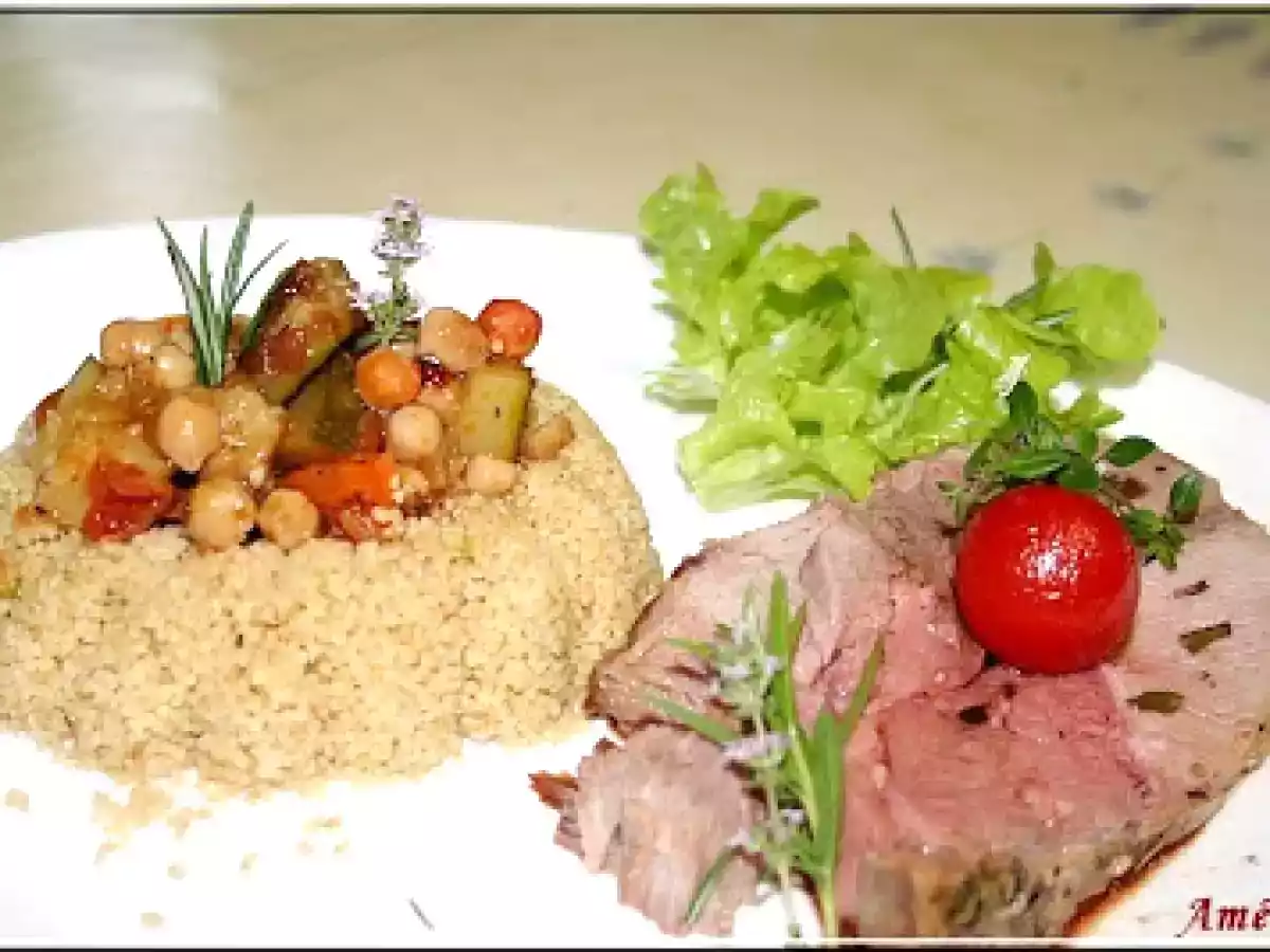 Gigot marine aux romarin et thym - garniture facon couscous votez maintenant PrécédentSuivant Platfacile1 h 50 m227 Kcal Envoyer cette recette à un ami Imprimer cette page Poser une question à l'auteur Publier votre photo de cette recette Ingrédients 8 Un gigot d'agneau Herbes (thym, romarin) Huile d'olive Ail persil sel poivre Pour la garniture : Courgettes jaunes et vertes Tomates Aubergine Oignons Ail persil origan basilic Sel poivre Bouillon de volaille Pois chiches Semoule de couscous