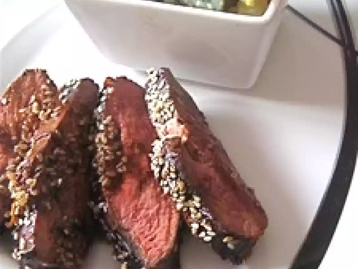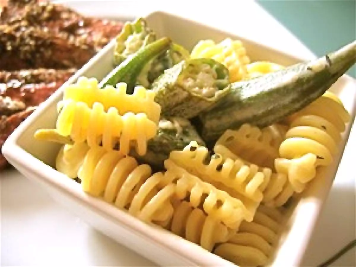 Gombos et pâtes à l'ail et au citron et filet de canard rôti et laqué au balsamique