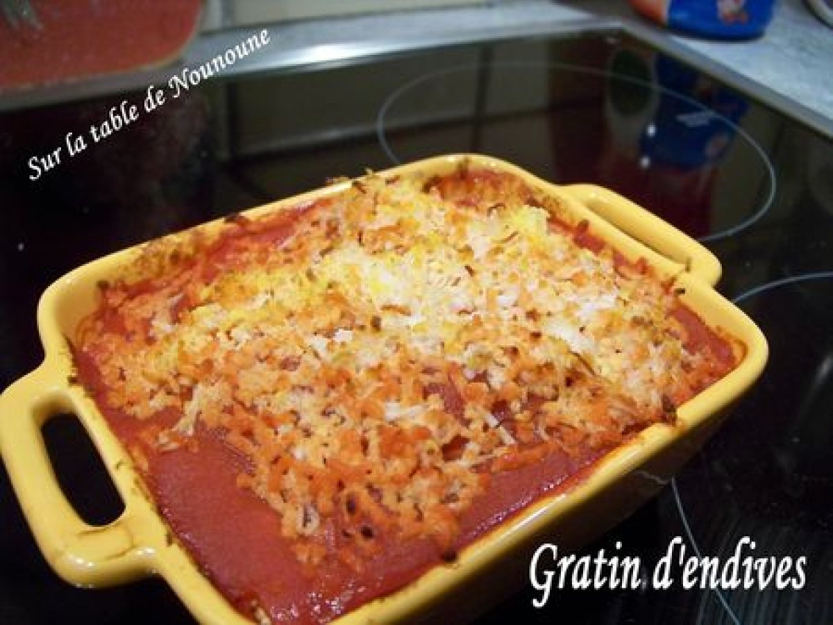 Gratin aux endives PrécédentSuivant Platfacile20 min219 Kcal Envoyer cette recette à un ami Imprimer cette page Poser une question à l'auteur Publier votre photo de cette recette Ingrédients 2 4 endives 4 oeufs durs 2 oignons émincés 1 brique de coulis de tomate sel poivre Coût estimé: 2.26Euros€ (1.13€/part)