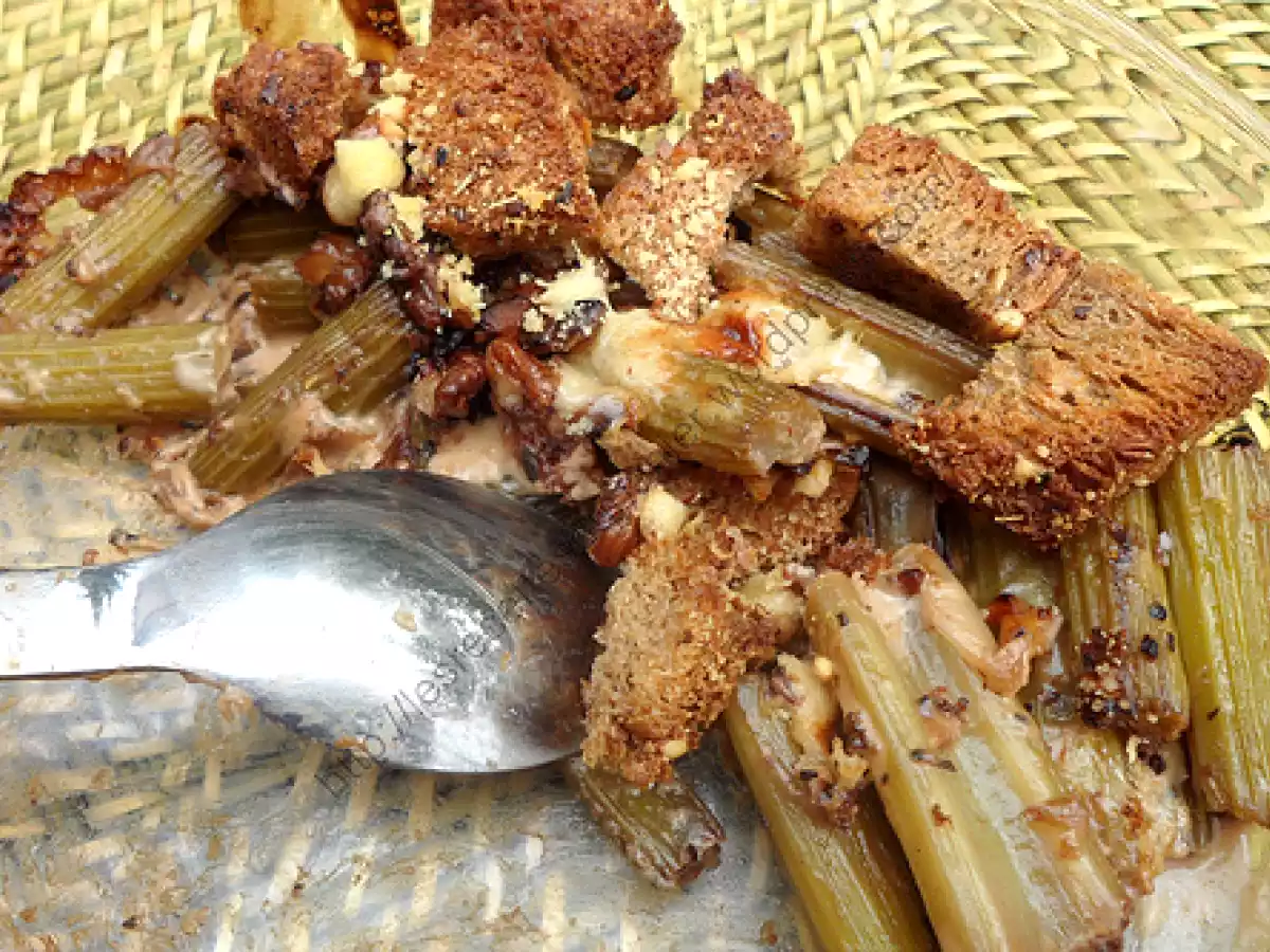 Gratin de céléri-branche à la crème Platfacile1 h 5 m564 Kcal Envoyer cette recette à un ami Imprimer cette page Poser une question à l'auteur Publier votre photo de cette recette Ingrédients 4 1 pied de céleri 1 oignon 2 feuilles de laurier 200 g de pain complet 100 g de noix concassées 75 ml de vin blanc, rosé ou peu importe 300 ml de bouillon de volaille 100 ml de crème épaisse du parmesan sel poivre huile d’olive