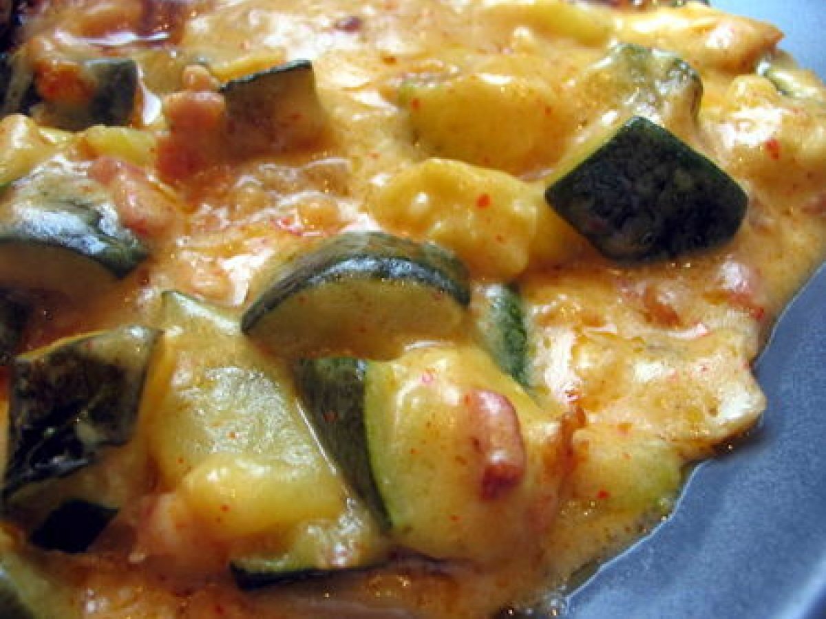 Voici aujourd'hui le gratin de courgettes au piment d'Espelette.Avec une vulgaire simple mais délicieuse sauce blanche...