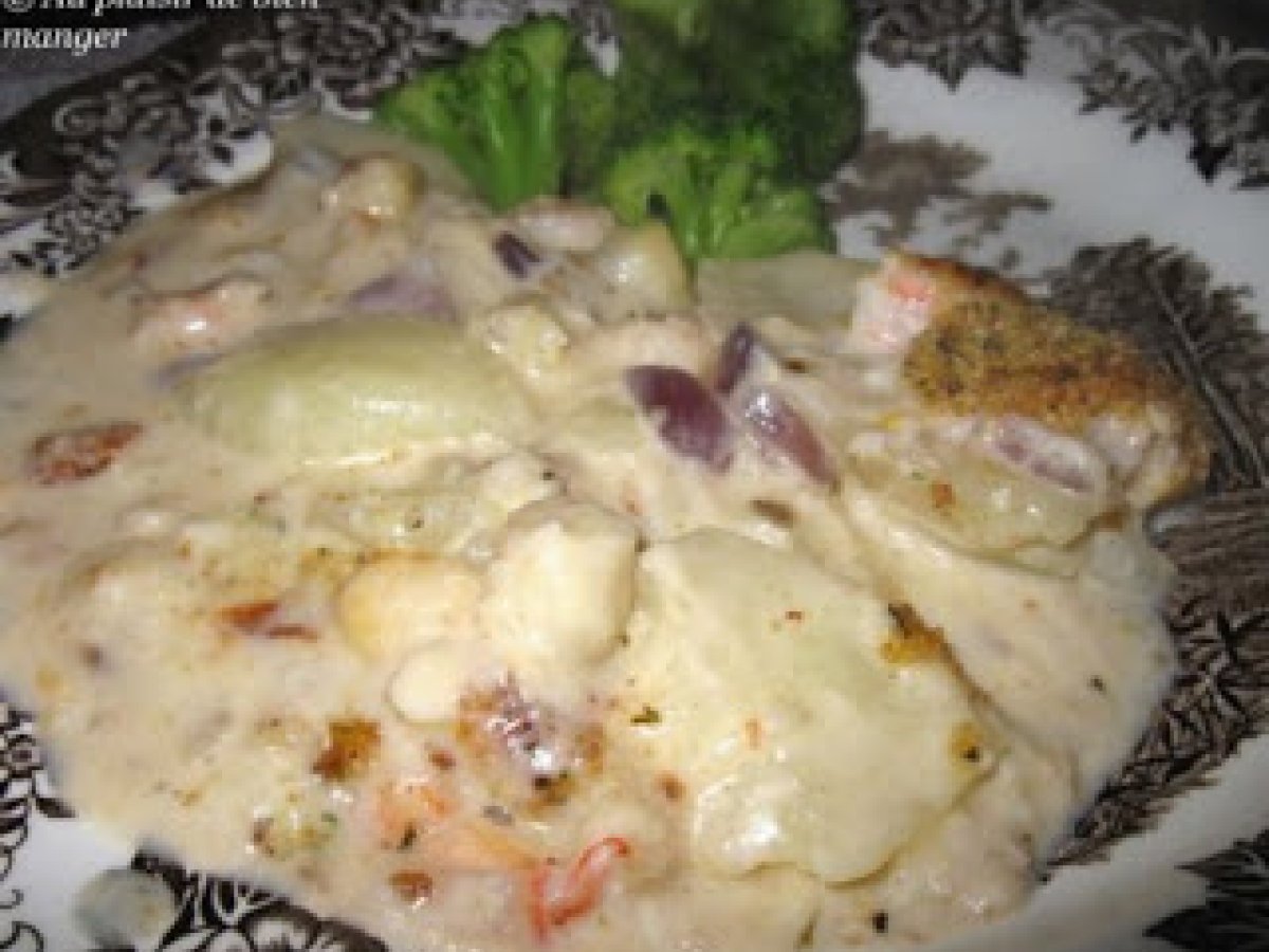 Gratin de fruits de mer votez maintenant Platfacile1 h 26 m852 Kcal Envoyer cette recette à un ami Imprimer cette page Poser une question à l'auteur Publier votre photo de cette recette Ingrédients 4 2 cuillères à table (30 ml) de beurre 1/2 lbs (225 g) de chair de crabe, bien égouttée 1/2 lbs (225 g) de chair de homard, bien égouttée (remplacer par des pétoncles) 1/2 lbs (225 g) de crevettes nordiques, décortiquées et bien égouttées 3 cuillères à table (45 ml) de farine 1 tasse (250 ml) de crème 35 % ou 15 % épaisse 1 tasse (250 ml) de lait 1/2 tasse (125 ml) de vin blanc ou bouillon pour poisson et fruits de mer ( vermouth) 1 lbs (450 g) de pommes de terre, pelées et coupées en tranches de 1/4 po (0.5 cm) d'épaisseur sel poivre 3/4 tasse (190 ml) d'oignons, hachés finement 1 tasse (250 ml) de cheddar, râpé 1 cuillère à table (15 ml) de ciboulette