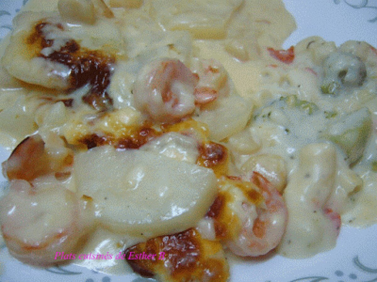 Voici un excellent gratin tout en saveur qui regorge plein de bons fruits de mer. Et avec les pommes de terre, ça donne un mets encore plus complet!