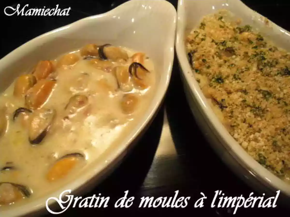Gratin de moules à l'impérial Platfacile30 min199 Kcal Envoyer cette recette à un ami Imprimer cette page Poser une question à l'auteur Publier votre photo de cette recette Ingrédients 2 250 g de moules 1 belle échalote 1 petite cuillère à soupe de farine 2 grosses cuillères de crème fraîche 3 cuillères à soupe de panure à l'impérial sel poivre Coût estimé: 1.68Euros€ (0.84€/part)