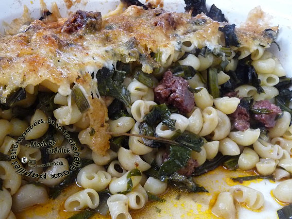 Gratin de pâtes aux merguez, ail et blettes Platfacile1 h 1 m Envoyer cette recette à un ami Imprimer cette page Poser une question à l'auteur Publier votre photo de cette recette Ingrédients 6 300 à 400 g de pâtes 300 à 500 g de blettes (sauvages et/ou cultivées) 2 boules de mozzarella 50 g de parmesan 2 cuillères à soupe de chapelure 6 gousse d'ail 3 tiges de marjolaine Paprika doux Sel poivre