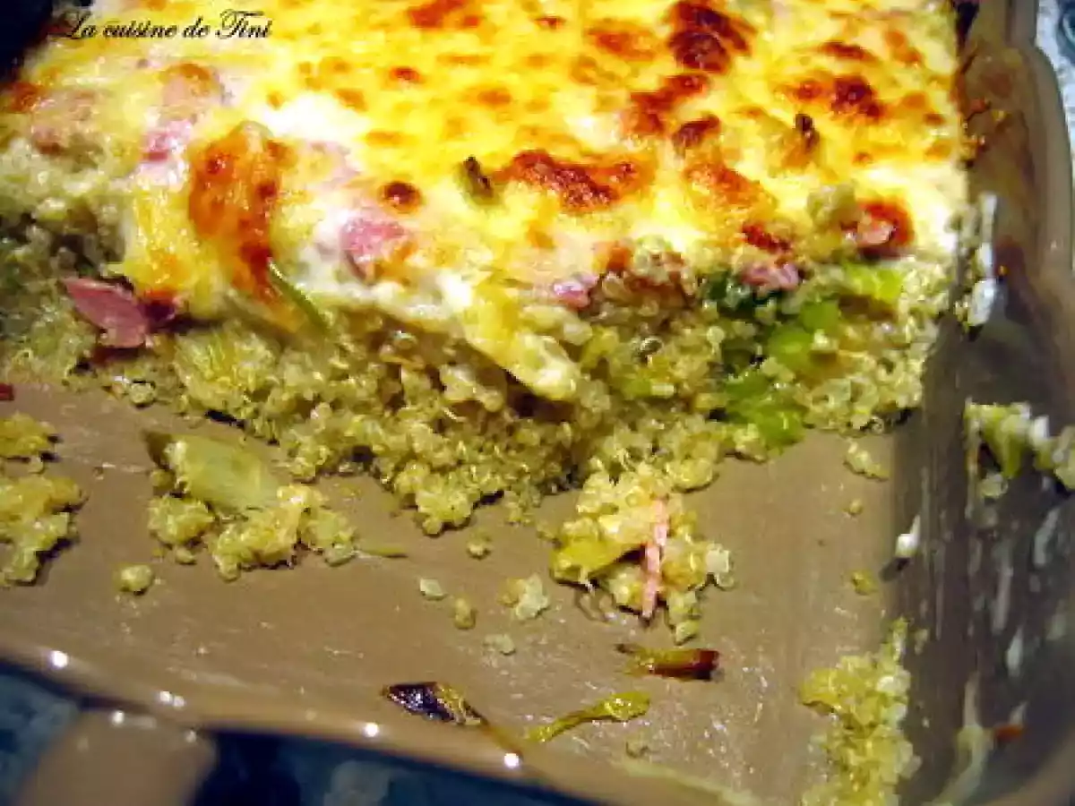 Gratin de quinoa aux poireaux votez maintenant PrécédentSuivant Platfacile50 min947 Kcal Envoyer cette recette à un ami Imprimer cette page Poser une question à l'auteur Publier votre photo de cette recette Ingrédients 2 500 g de quinoa 3 blancs de poireaux 50 cl de lait 30 g de beurre 30 g de farine du parmesan râpé 100 g de comté 1 cube de bouillon 1 cuillère à soupe d'huile d'olive sel et poivre