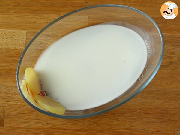 Couper les tranches de pancetta en deux. Répartir la crème dans le fond du moule à gratin.
