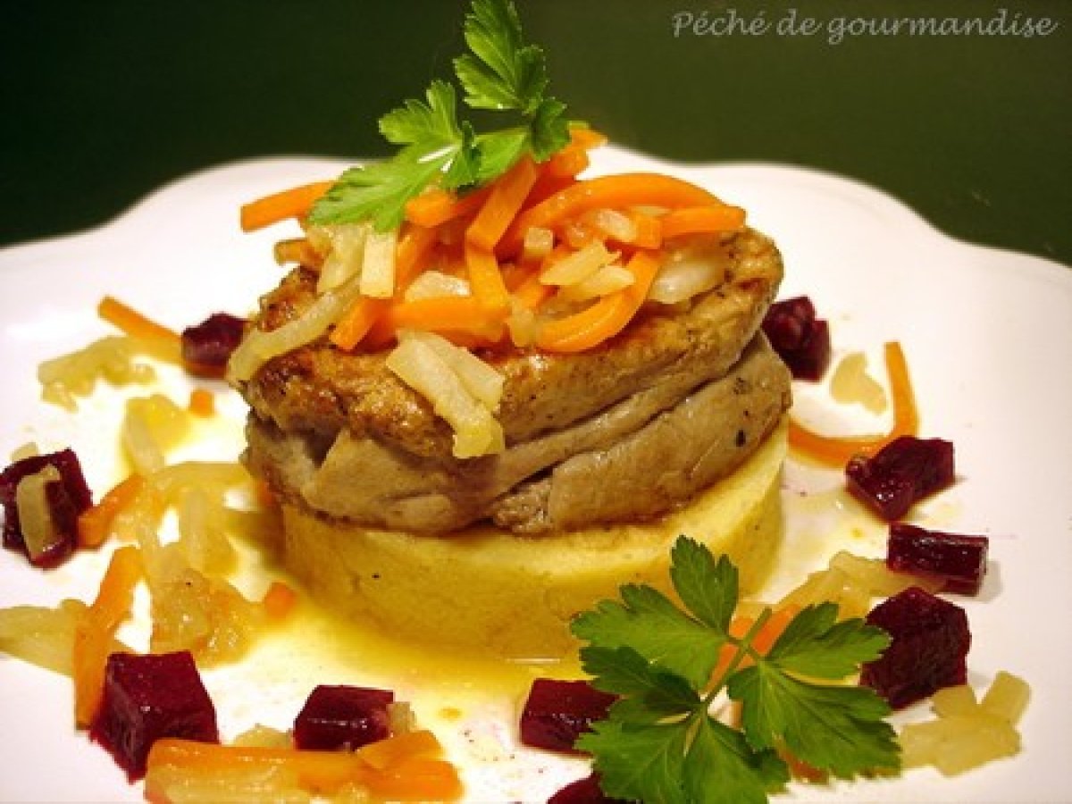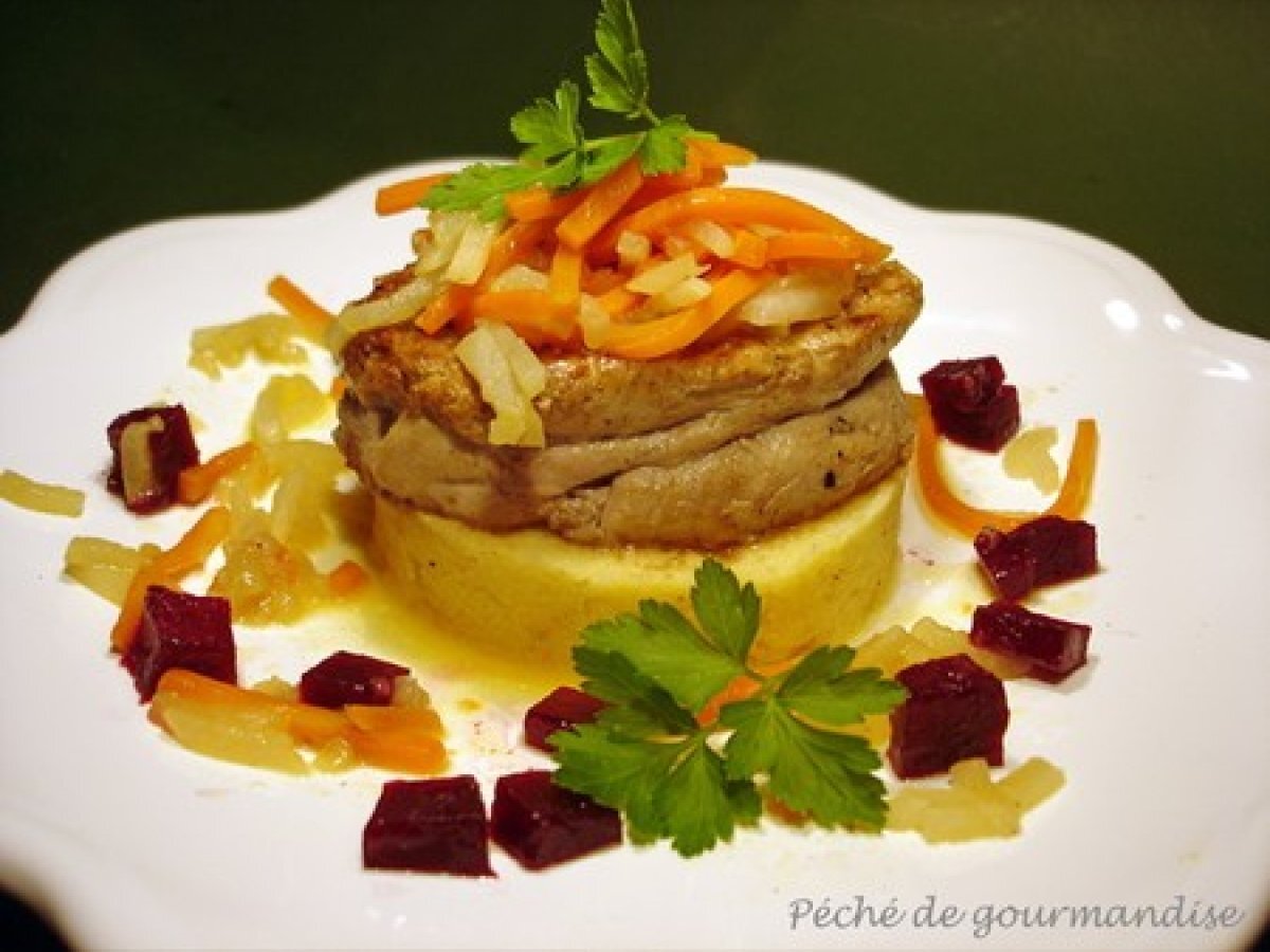 Grenadin de veau et ses petits légumes sur coussin de polenta PrécédentSuivant Platfacile50 min1262 Kcal Envoyer cette recette à un ami Imprimer cette page Poser une question à l'auteur Publier votre photo de cette recette C'est un plat digne de vos plus belles tables pour les fêtes. Ingrédients 4 4 grenadins de veau dans le filet mignon 2 navets moyens 1 betterave rouge cuite 2 carottes 70 g de beurre 15 cl de cidre 8 feuilles de basilic rouge (persil) Sel et poivre Pour la polenta : 80 g de semoule à polenta précuite (100g) 20 g de beurre (25g) 30 g de parmesan râpé (un peu plus de 35 g) 30 cl d'eau (37,5 cl) Noix de muscade râpée Sel et poivre