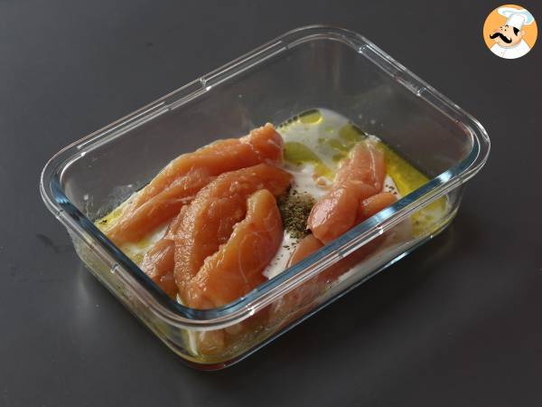 Ajouter les morceaux de poulet (ici aiguillettes entières) et bien mélanger le tout. Fermer le récipient et mettre au frais pendant 1 heure.