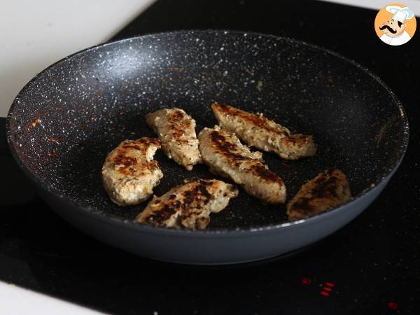 Faire cuire les morceaux de poulet dans une poêle sur feu moyen/fort jusqu'à ce qu'ils soient bien dorés.