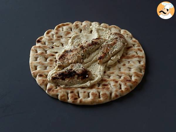Tartiner du houmous au centre du pain pita puis ajouter les morceaux de poulet cuits.