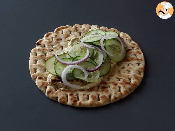 Les garnitures classiques incluent des crudités (ici nous avons choisi l’oignon rouge et le concombre). Vous pouvez également ajouter des tomates, de la salade, des poivrons grillés, des olives, ou des feuilles de persil frais pour plus de saveur et de croquant.