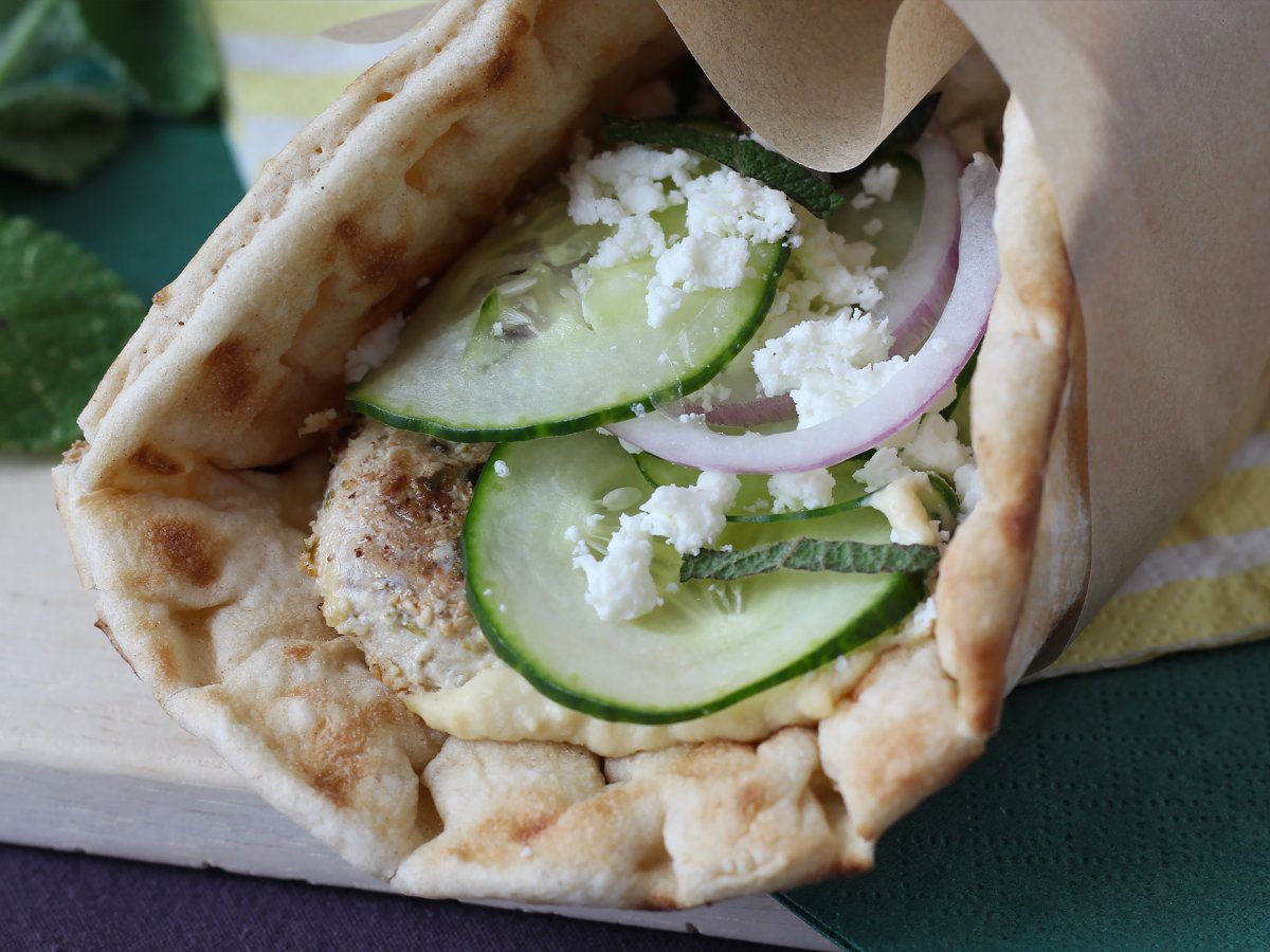 Prêt à voyager en Grèce sans quitter votre cuisine? Découvrez le Gyros au poulet, le sandwich grec qui va faire chavirer vos papilles! Ce délice méditerranéen est composé de poulet mariné, grillé à la perfection, et servi dans un pain pita moelleux. Ajoutez à cela un houmous super crémeux, de l'oignon rouge et du concombre croquant, avec une touche de feta pour la gourmandise. Autrement dit, un équilibre parfait de saveurs et de couleurs qui va vous donner des envies de voyage :-)