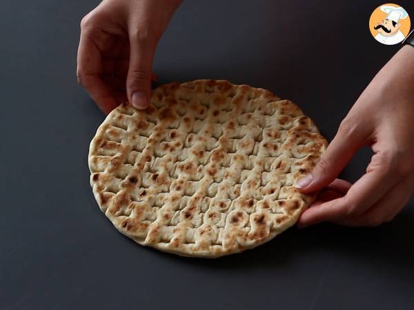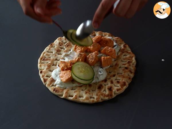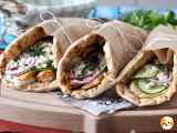Réchauffer le pain pita au four quelques minutes ou au micro-ondes pendant environ 30 secondes avant de le garnir.
