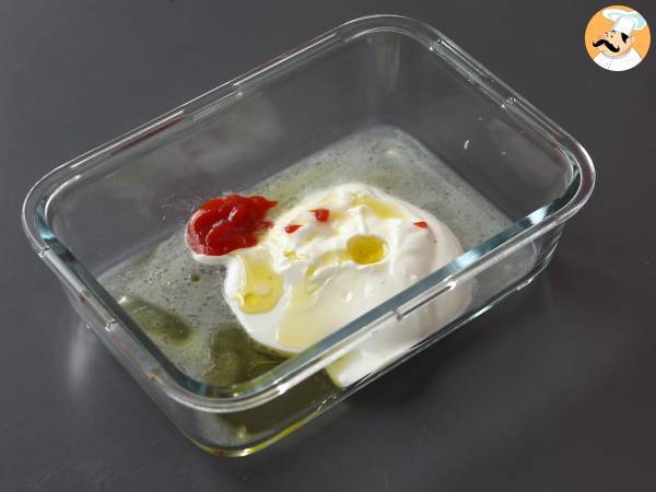 Mettre ces ingrédients dans une boite hermétique ou un sac congélation: le yaourt grec, le jus de citron, le sel, le poivre, la sriracha et l'huile d'olive.