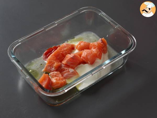 Ajouter le saumon coupé en gros morceaux et bien mélanger. Placer au frais pendant 1 heure.