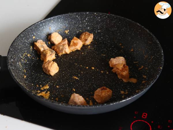 Faire cuire les morceaux de saumon mariné dans une poêle sur feu moyen/fort jusqu'à ce qu'ils soient bien dorés.