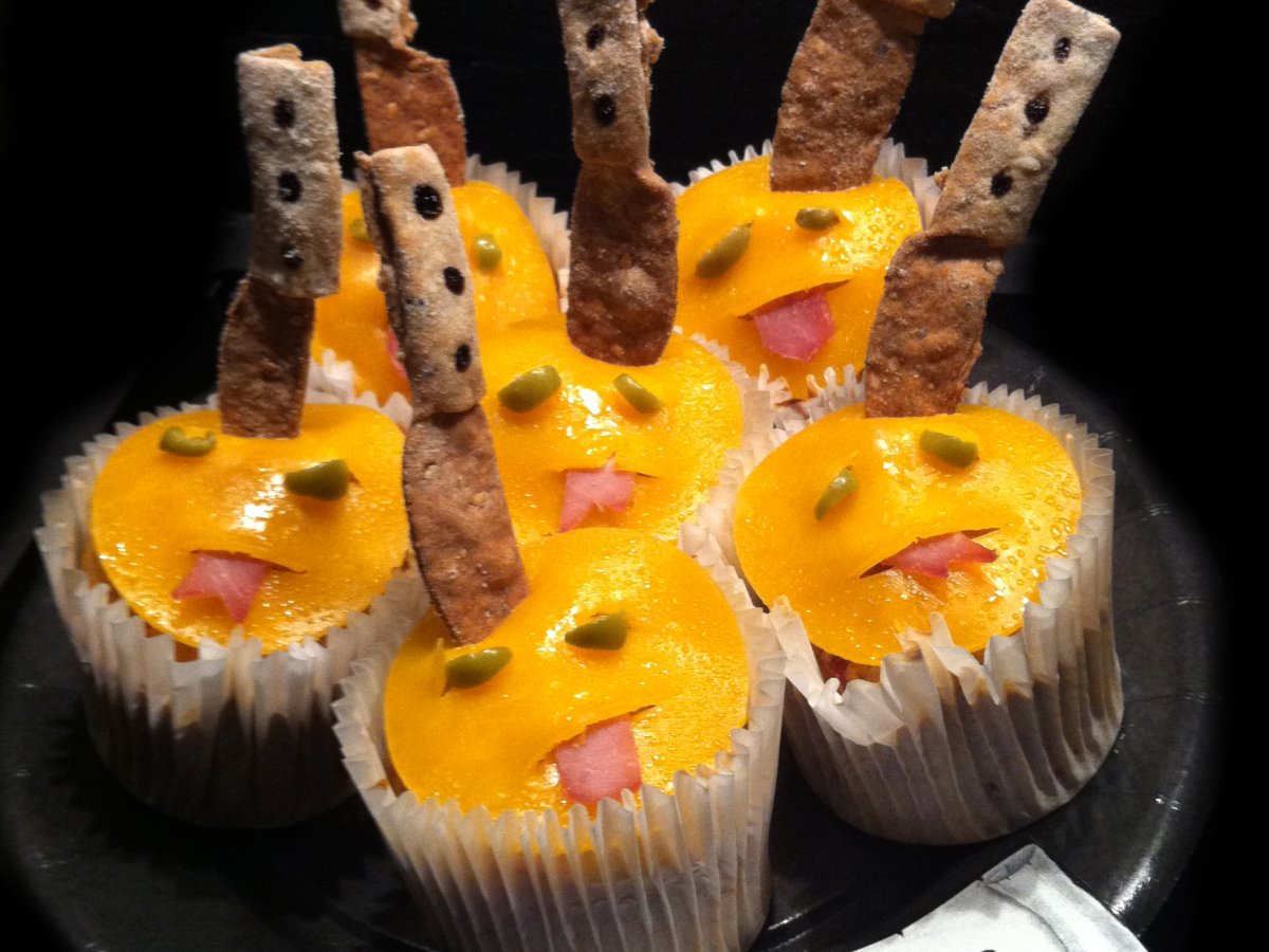 Halloween blob muffins ! Platfacile30 min1111 Kcal Envoyer cette recette à un ami Imprimer cette page Poser une question à l'auteur Publier votre photo de cette recette Ingrédients 6 1 yaourt nature 1 pot de yaourt de farine de blé complet T150 1 pot de yaourt de farine de blé T45 1/2 sachet de levure 2 oeufs 200 g de lardons de bacon 1 cs d'huile d'olive 10 mini tomates coeur de pigeon 10 olives vertes pour la déco: 6 tranches de cheddar 3 olives vertes 1/2 tranche de jambon Coût estimé: 7.06Euros€ (1.18€/part)