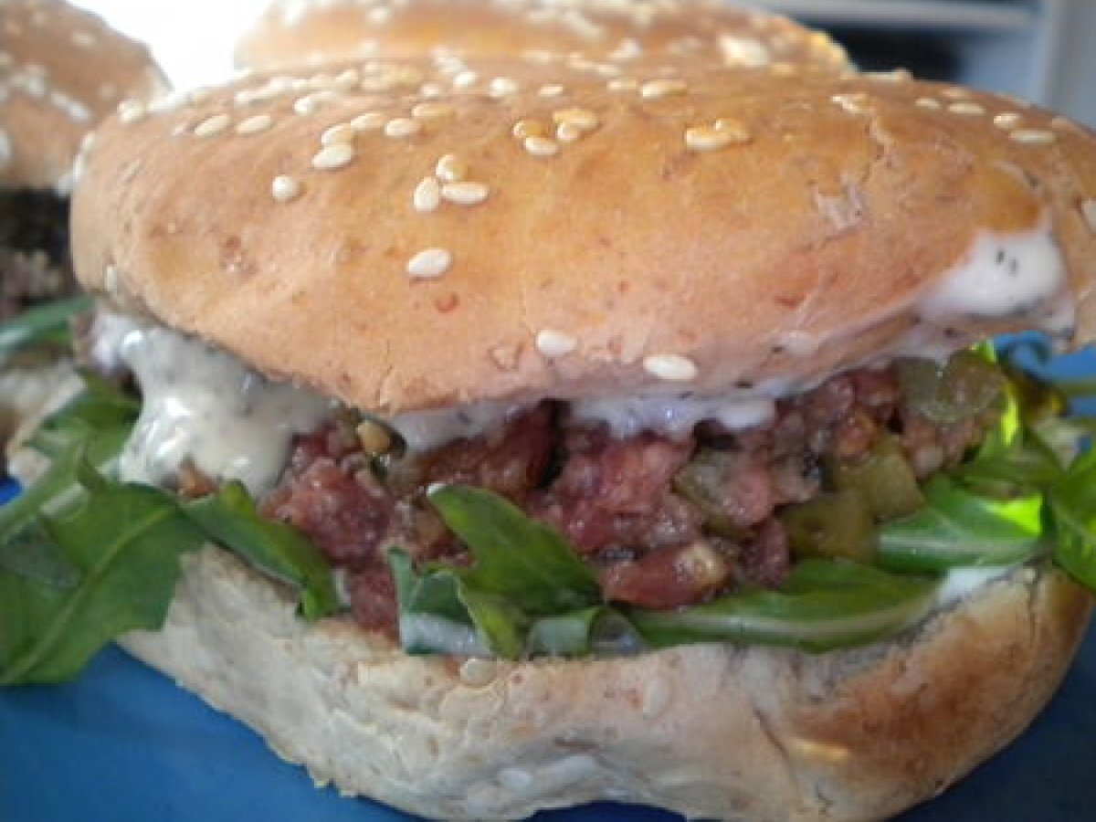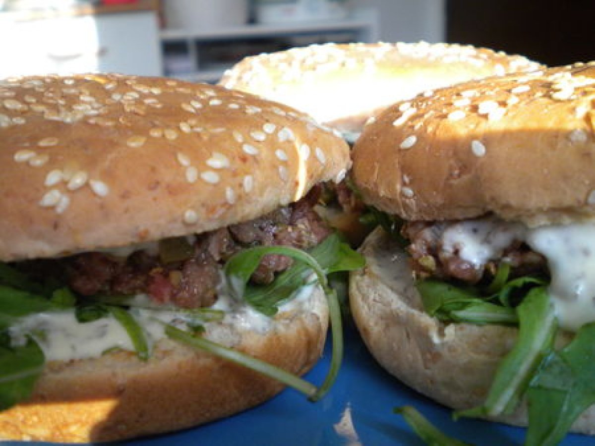Hamburger au steak tartare votez maintenant PrécédentSuivant Platfacile25 min660 Kcal Envoyer cette recette à un ami Imprimer cette page Poser une question à l'auteur Publier votre photo de cette recette Ingrédients 4 4 pains à hamburger à la farine compète 250 g de boeuf haché frais 2 cuillères à soupede basilic ciselé 1 salade roquette 10 g d'échalote 2 citrons 1 jaune d'oeuf 2 cuillères à soupe de crème fraiche 4 cuillères à soupe de mayonnaise allégée 20 g de cornichons 2 cuillères à soupe de sauce soja 2 cuillères à soupe de grains de poivre vert 1 cuillère à soupe d'huile d'olive poivre Coût estimé: 9.56Euros€ (2.39€/part)