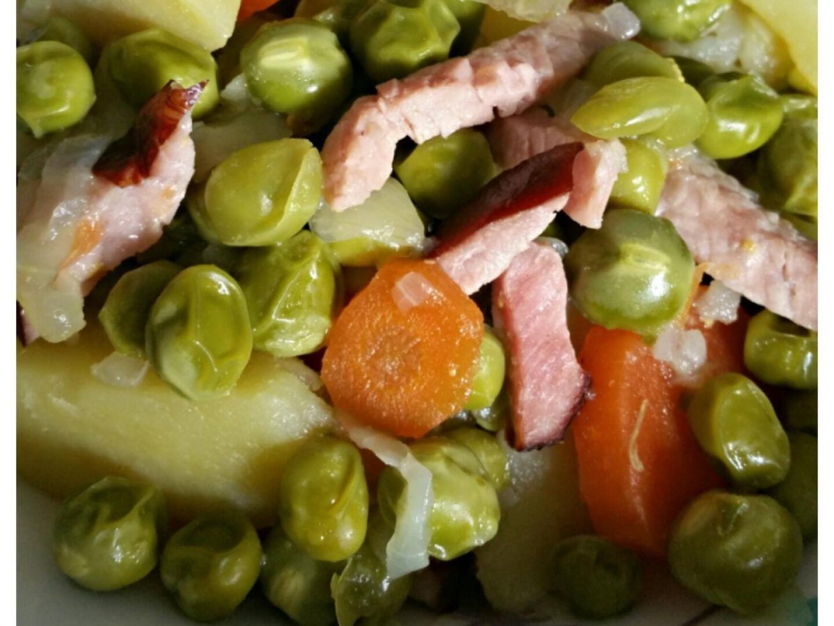 - Ajoutez les petits pois écossés, les pommes de terres épluchées en quartiers ainsi que les carottes en rondelles, salez, poivrez et mettez de l'eau jusqu'à hauteur. Cuire à feux doux, 30 min environ.
