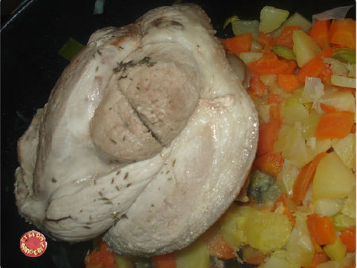 - 20 minutes avant la fin dans une cocotte mettre des pommes de terre, carottes, poireaux rajouter de l'eau du cuisson du jarret et laisser mijoter 20 minutes donc.