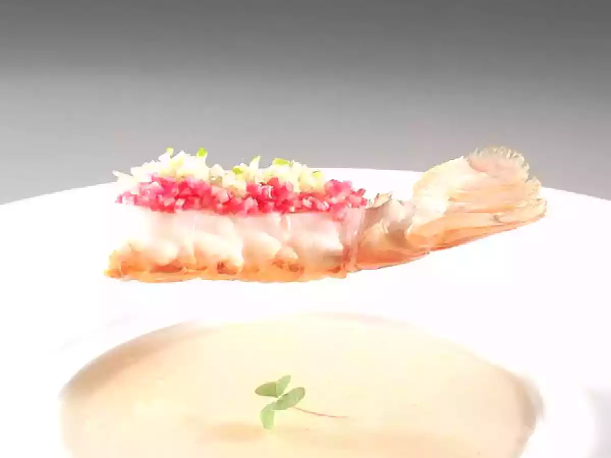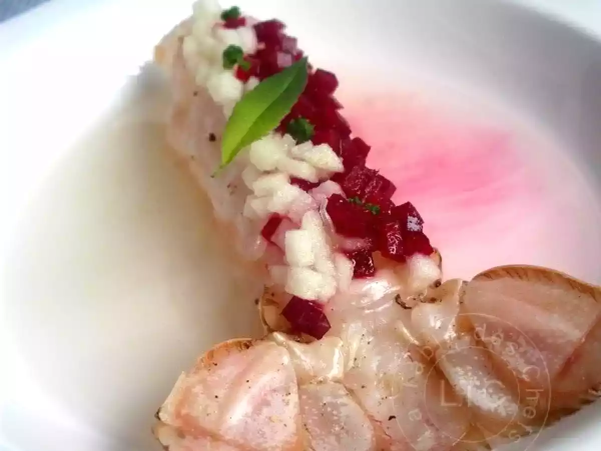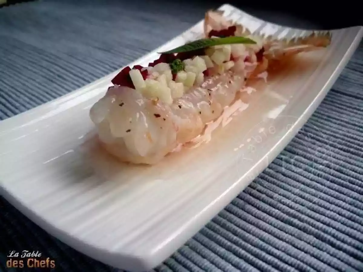 Jean sulpice ? langoustine, jus pomme verveine PrécédentSuivant Platfacile45 min Envoyer cette recette à un ami Imprimer cette page Poser une question à l'auteur Publier votre photo de cette recette Ingrédients 4 4 grosses langoustines ou langoustines royales 5 pommes Granny Smtith 1 betterave chioggia ou à défaut une betterave rouge 1 citron vert pour le zeste et le jus, donc si possible sans traitement ou bio huile d’amande poivre de Madagascar ou un poivre doux, seichuan par exemple une belle tige de verveine de 30 cm