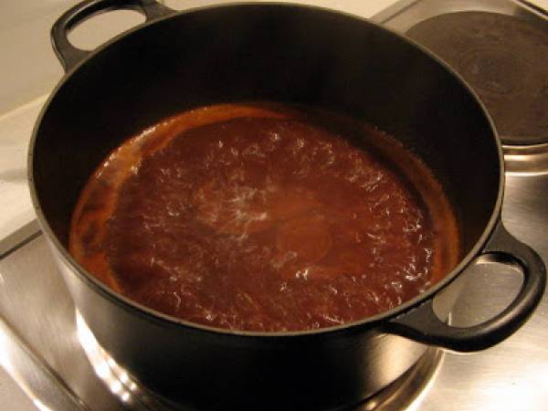 Laissez réduire un peu. - Ensuite, versez le vin rouge et un peu de bouillon de boeuf.