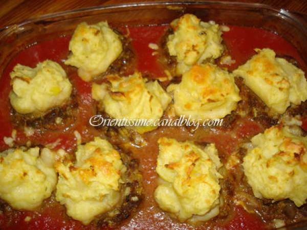 Koftat hassan pacha : hachis parmentier turc Platfacile35 min276 Kcal Envoyer cette recette à un ami Imprimer cette page Poser une question à l'auteur Publier votre photo de cette recette Ingrédients 6 Pour le haché : 300 g de viande hachée 1 oeuf 1 oignon haché 1 cuillère à soupe de chapelure sel poivre épices de votre choix Pour la purée : 500 g de pommes de terre 100 ml de lait sel poivre noix de muscade fromage râpé Pour la sauce : 250 g de tomates pelées 1 cuillères à soupe d'huile d'olive sel poivre 1 cuillère à café d'arôme basilic Coût estimé: 6.65Euros€ (1.11€/part)