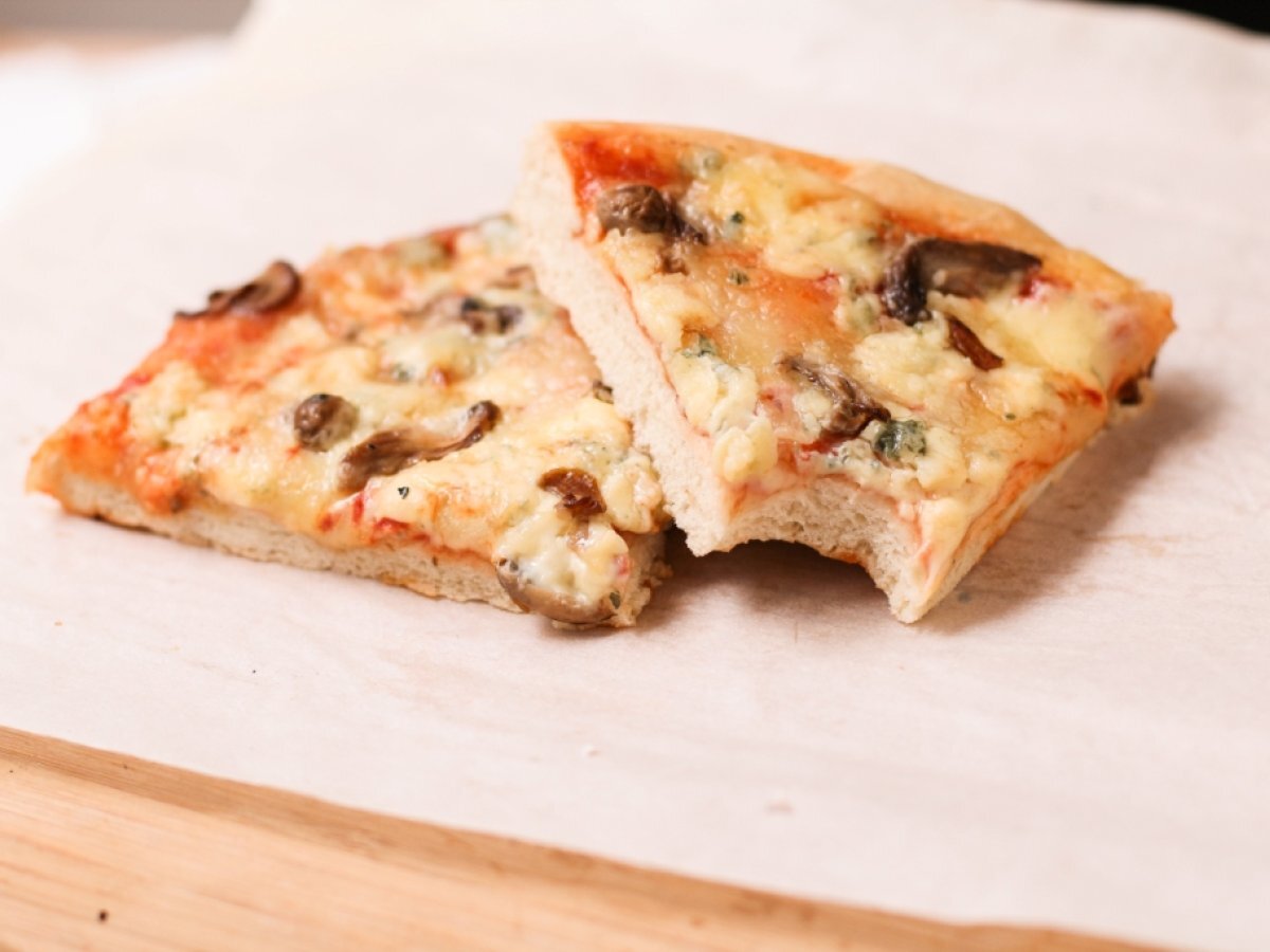 - Préchauffer le four à 220°C. Dégazer la pâte avec les poings, la couper en 2 parties égales, puis étaler sur une plaque de cuisson garnie de papier sulfurisé. Utiliser le bout des doigts pour étaler la pâte en un disque d’environ 25 cm de diamètre, avec les bords plus épais pour former la croûte. Cela peut demander un peu de temps car la pâte sera élastique, mais bien appuyer sur le centre du disque pour que la pâte ne soit pas trop épaisse (elle va gonfler à la cuisson). Ajouter la garniture choisie, et faire cuire pendant 20 minutes. Servir chaud.