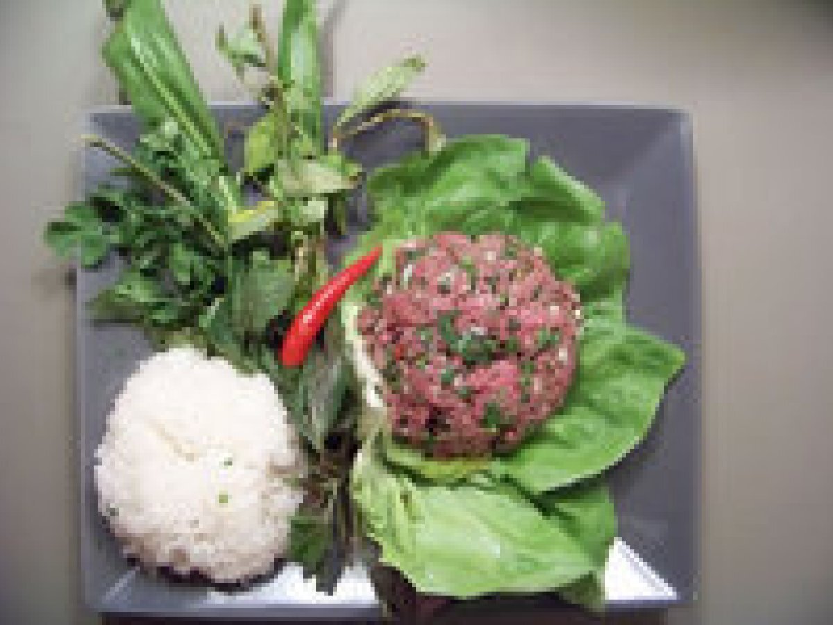 - Ajoutez par dessus le laab, servez avec un bol de riz gluant.