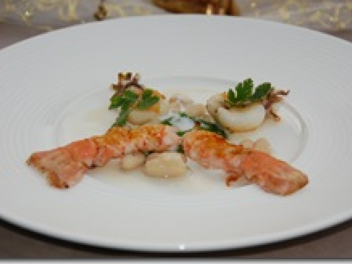 Langoustines et chipirons au coulis de haricot coco et emulsion à la citronnelle