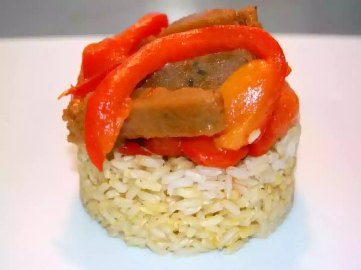Remplir chaque cercle de quatre cuillères à soupe de riz bien bombées en tapotant avec le dos de la cuillère pour bien l'aplatir – Il doit être à la même hauteur sur toute la surface – Ajouter une poignée de marinade de poivrons rouges et seitan sur le riz. - Démouler doucement sans forcer ni toucher la préparation en partant du bas et remontant vers le haut.