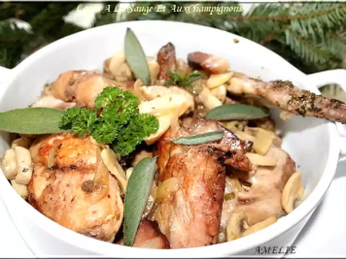 - Faites revenir les gousses d'ail dans l'huile et un peu de beurre, ajouter une dizaine de feuilles de sauge et les morceaux de lapin, laissez dorer sur toutes les faces.