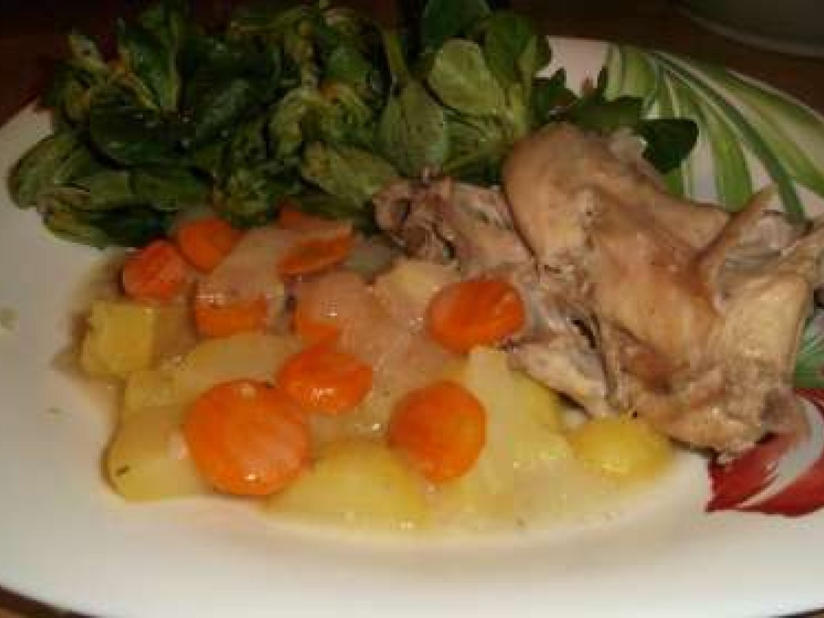 Epluchez l'oignon et les carottes puis coupez l'oignon en cube et les carottes en rondelles et ajoutez les au lapin.