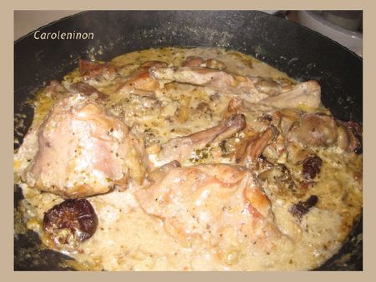 Lapin aux pruneaux et champignons Platfacile1 h 4 m523 Kcal Envoyer cette recette à un ami Imprimer cette page Poser une question à l'auteur Publier votre photo de cette recette Ingrédients 6 un lapin 2 oignons 2 gousses d'ail 1 grosse boîte de champignons (mélange) 24 pruneaux dénoyautés 20 cl de vin blanc 20 cl de crème fraîche liquide 4 cuillères à café de maïzena sel poivre bouquet garni